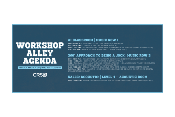 (Nashville, Tennessee — March 6, 2026) — Country Radio Seminar (CRS) announces the return of Workshop Alley, offering attendees a dynamic series of hands-on learning opportunities focused on innovation, on-air performance, and revenue growth. A cornerstone of CRS’s commitment to professional development, Workshop Alley delivers practical tools and actionable insights designed to help radio professionals thrive in a rapidly evolving landscape.