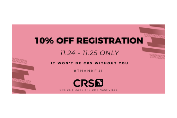 (Nashville, Tennessee – November 24, 2025) Country Radio Seminar (CRS) is pleased to announce its annual “Thankful” Sale, running Monday, November 24 through Tuesday, November 25, offering attendees an exclusive 10% discount on the current $698 CRS 2026 Three-Day Registration rate. No promo code is required. The discount will be automatically applied at checkout during the two-day sale.