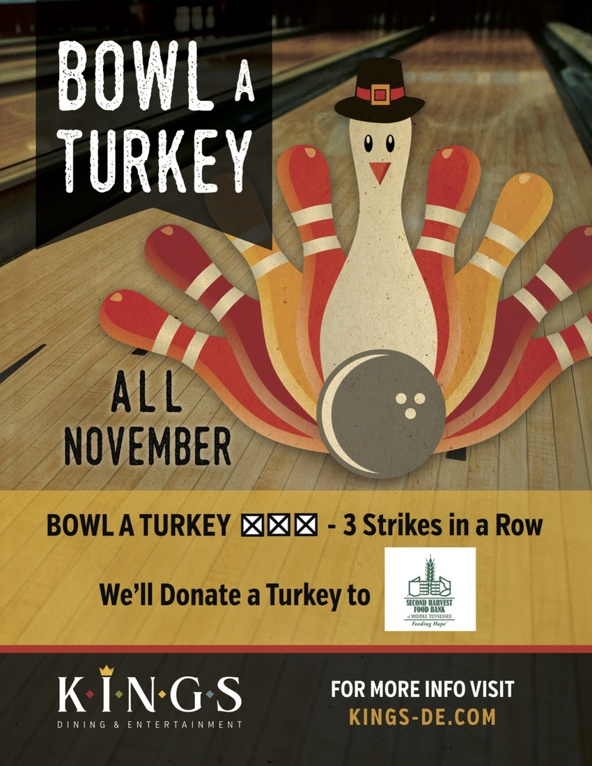 (Nashville, Tenn. – Nov. 14, 2018) – Kings Dining & Entertainment, located at CoolSprings Galleria in Franklin, Tenn., is celebrating the season of giving with their “Bowl-A-Turkey” promotion. Now through Nov. 30th, the venue is encouraging guests to “Bowl-A-Turkey” (three strikes) and Kings will donate a turkey in their honor to Second Harvest Food Bank of Middle Tennessee.
